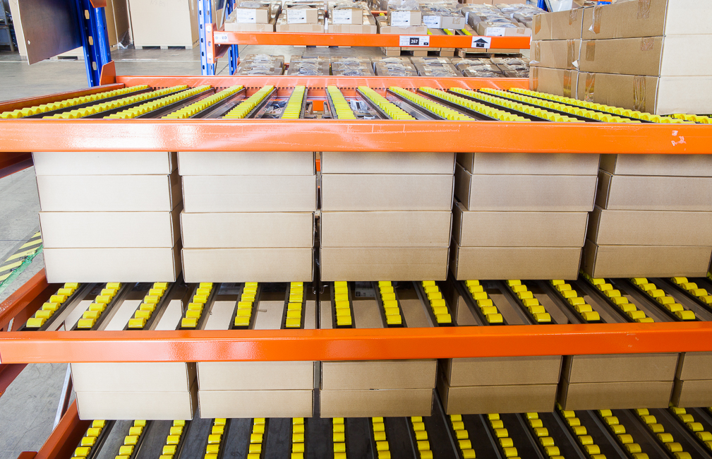 O Flow Rack, também conhecido como sistema dinâmico de abastecimento, é uma solução ideal para o picking manual de materiais de médio e pequeno volume, baseado no sistema FIFO (primeiro a entrar é o primeiro a sair).