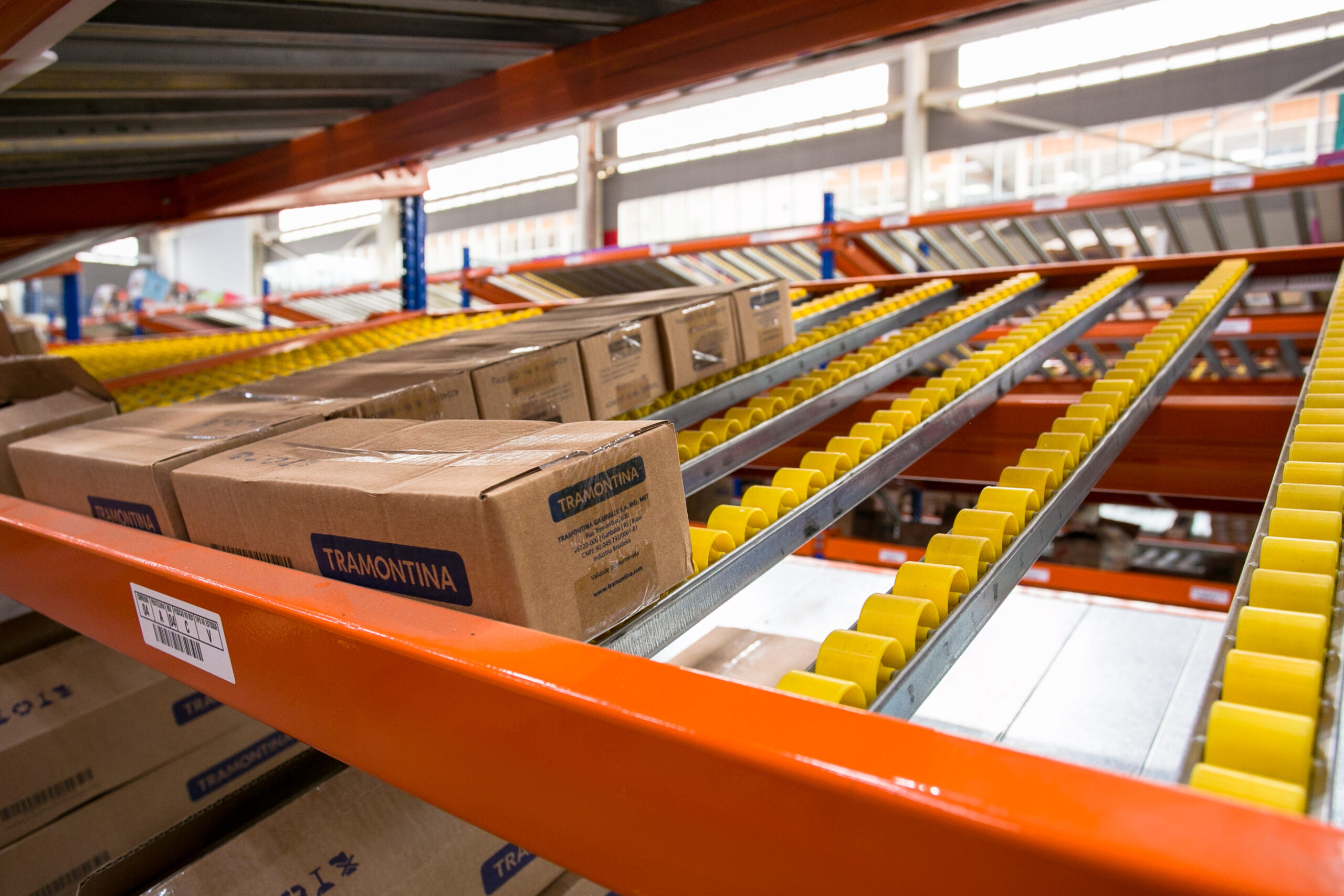 Esse sistema funciona através de trilhos e roldanas, onde as cargas são depositadas por uma das extremidades e deslocadas pela ação da gravidade, até a área de picking, onde os produtos são retirados e separados manualmente.