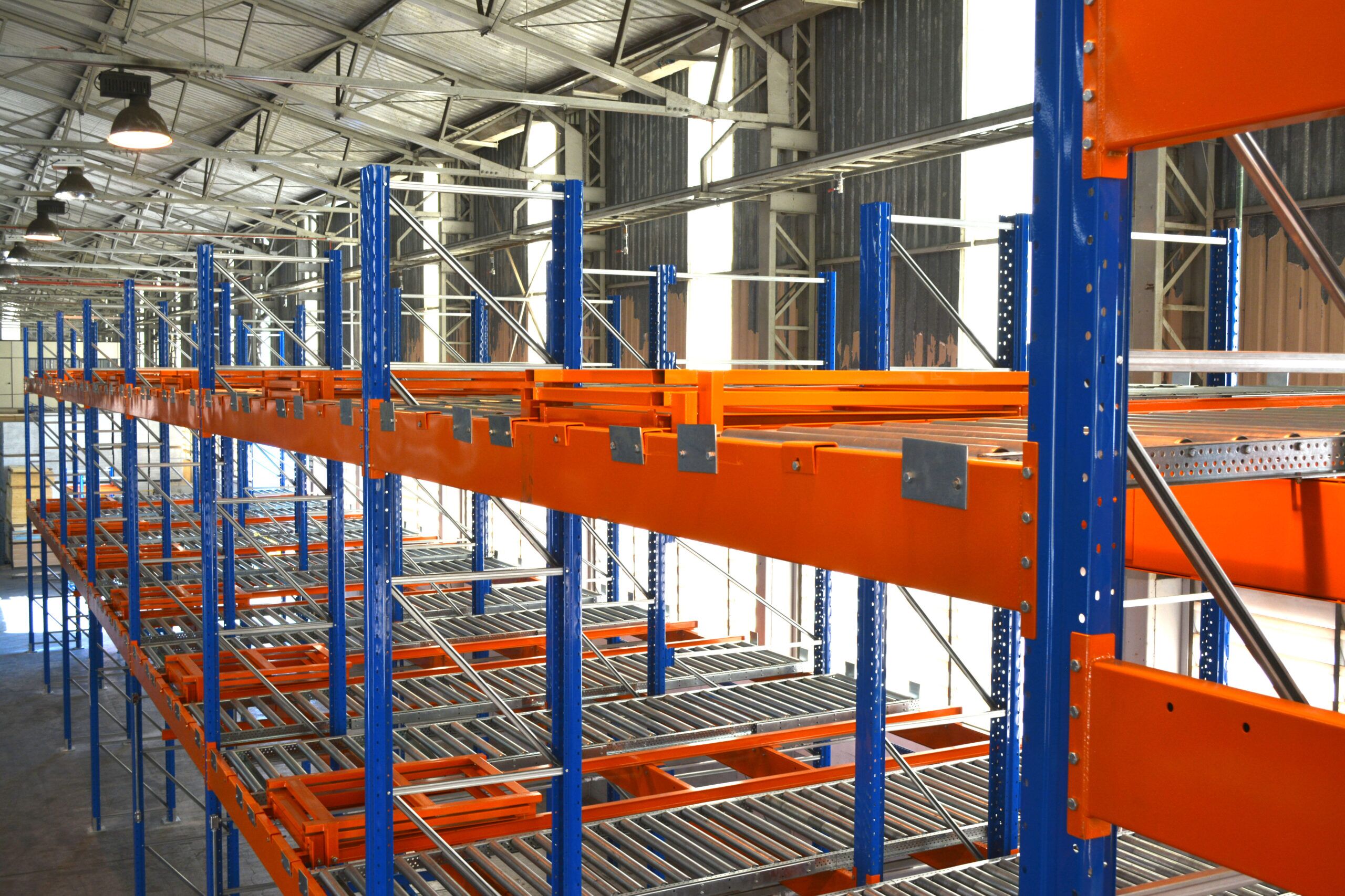 Os paletes se deslocam por impulso ao longo da estrutura do Push-Back, sendo impulsionados por carrinhos ou roletes, e movidos pela ação da gravidade para a área de carga e descarga. Esse sistema é capaz de armazenar até cinco níveis de profundidade, proporcionando um uso mais eficiente do espaço disponível.