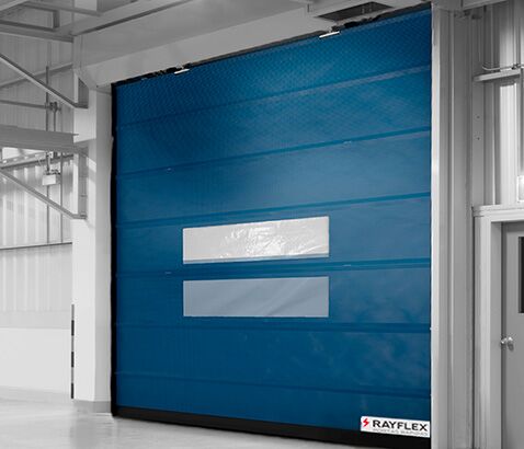 Porta rápida com reforço horizontal na lona, tornando-a resistente a pressões de vento de até120 km/h.